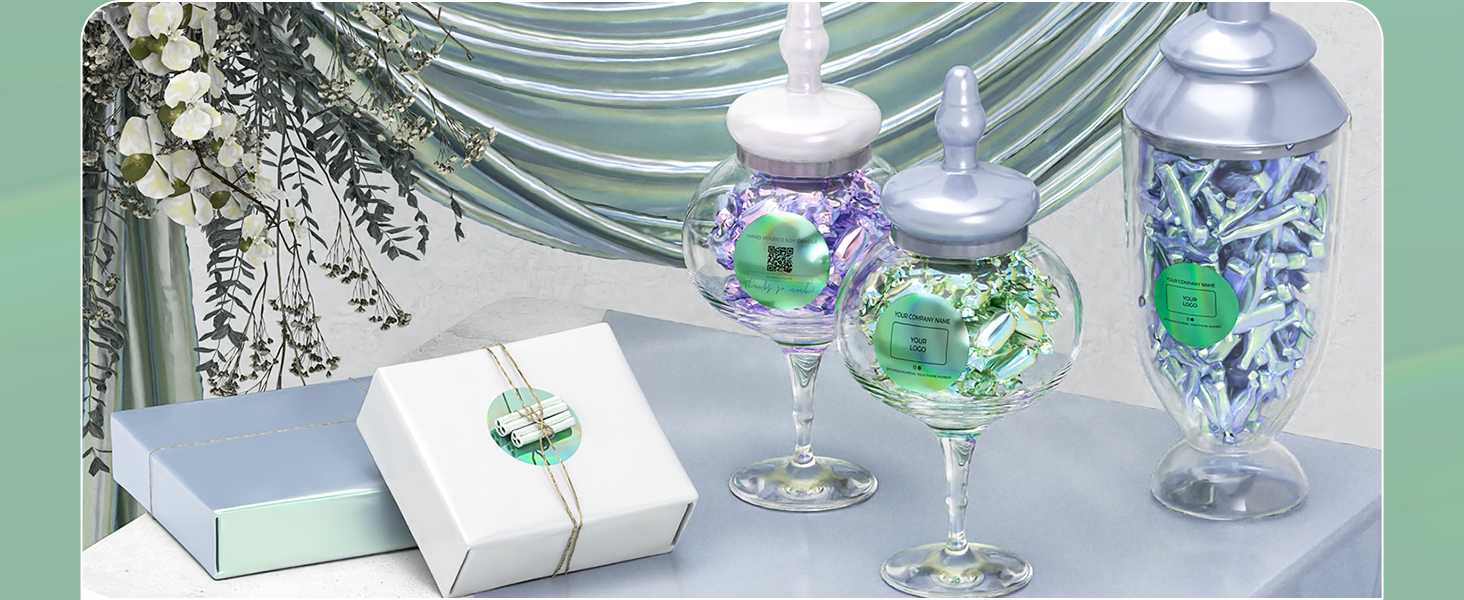 Logo stickers, thank-you labels, QR codes, product info labels.