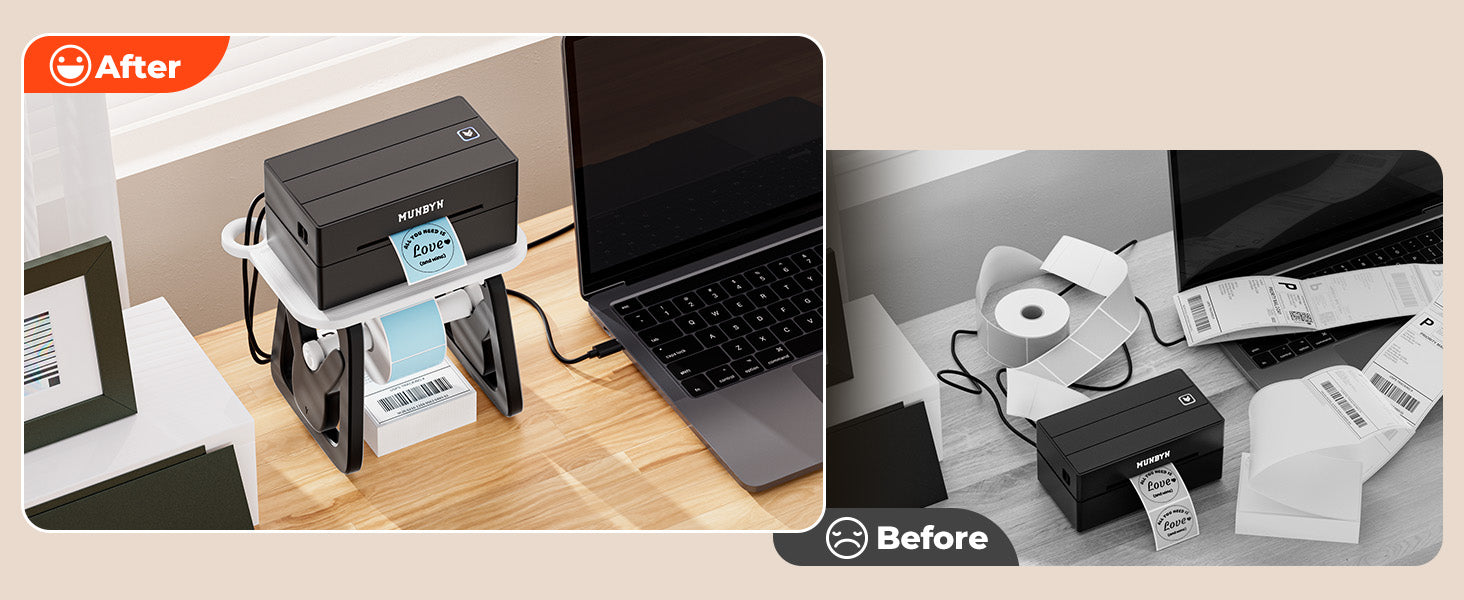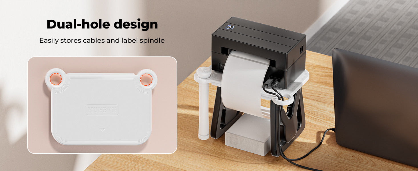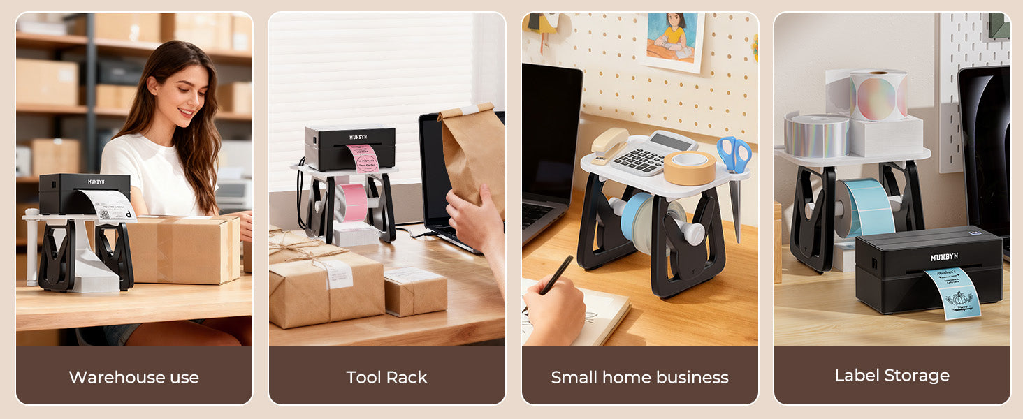 • 3-in-1 Label Holder: MUNBYN Label holder can store the printer and labels. The upper layer has holes on both sides to hide the power cord and provides a space to place label rollers, ensuring an organized workspace.