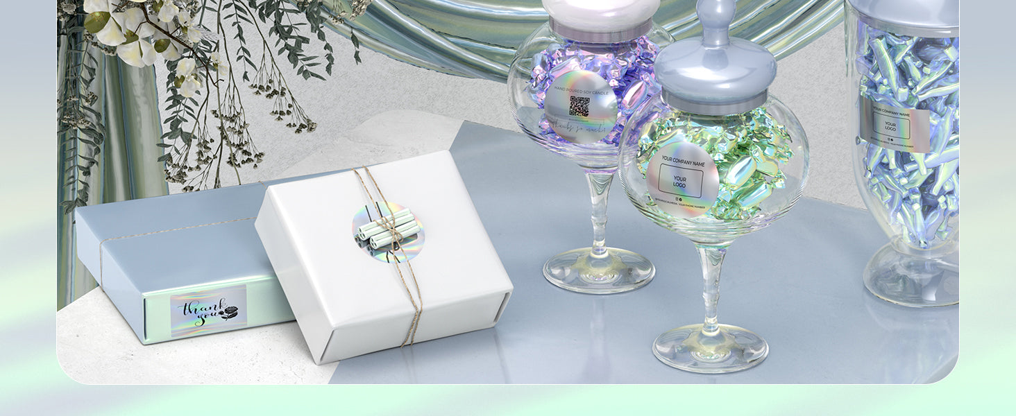 Logo stickers, thank-you labels, QR codes, product info labels.
