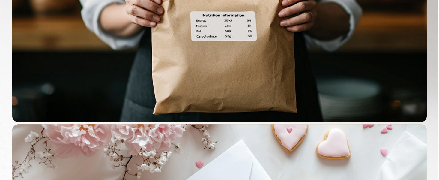 Logo stickers, thank-you labels, QR codes, product info labels.
