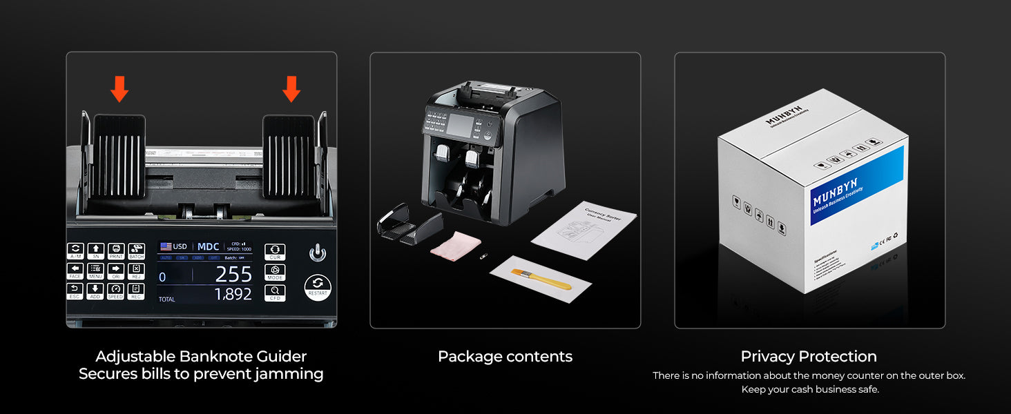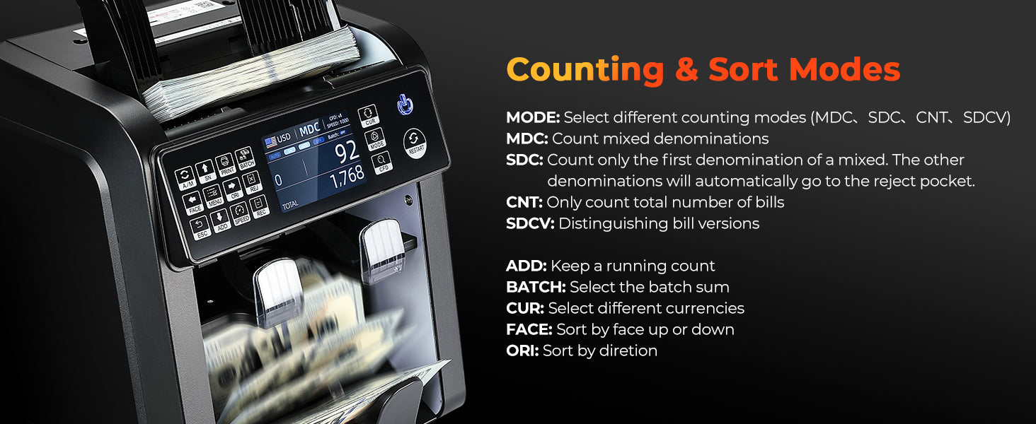 Counting Modes | Mixed Denomination Counting, Sorting, ADD, BATCH, ADD & BATCH, Auto / Manual Counting |
