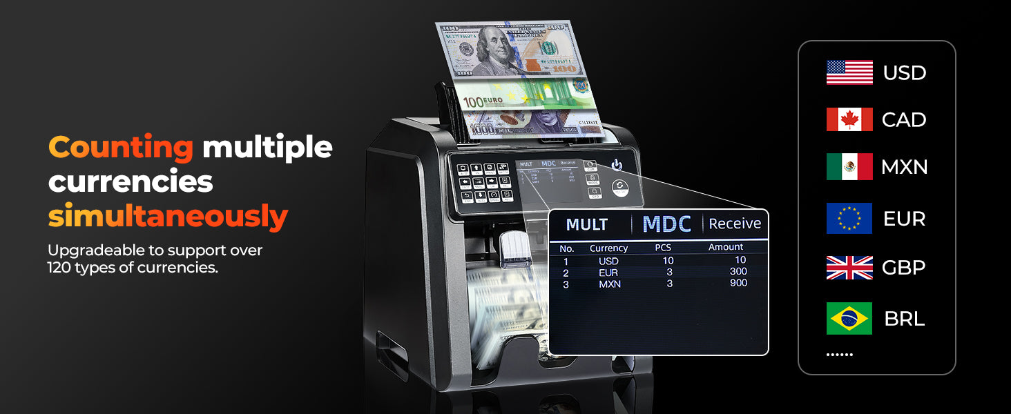 Multi-Currency Support | Supports 4 mixed currencies in one count (USD, EUR, CAD, MXN, LBP, etc.); Up to 120+ currencies with software updates |