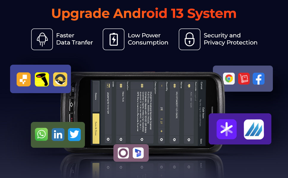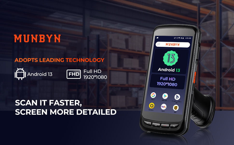 Powered by Android 13,  MUNBYN IPDA087 handheld scanner offers advanced security, smoother multitasking, and broad compatibility with enterprise apps—ideal for modern warehouse and logistics operations.