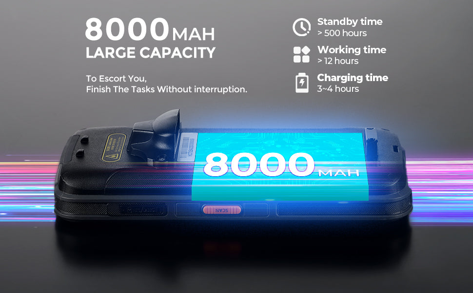 ✅[Larger Capacity Endurance] 8000mAh rechargeable Li-ion battery, the high capacity battery delivers up to an impressive 12 hours of power - enough for the longest shift. You no longer have to worry about being interrupted by power cuts. Just charge it for 3 hours and get 12 hours of work and 500 hours of standby time. The camera and the scan engine cannot be running at the same time. Please use the original charger, as using other chargers might cause charging issues.