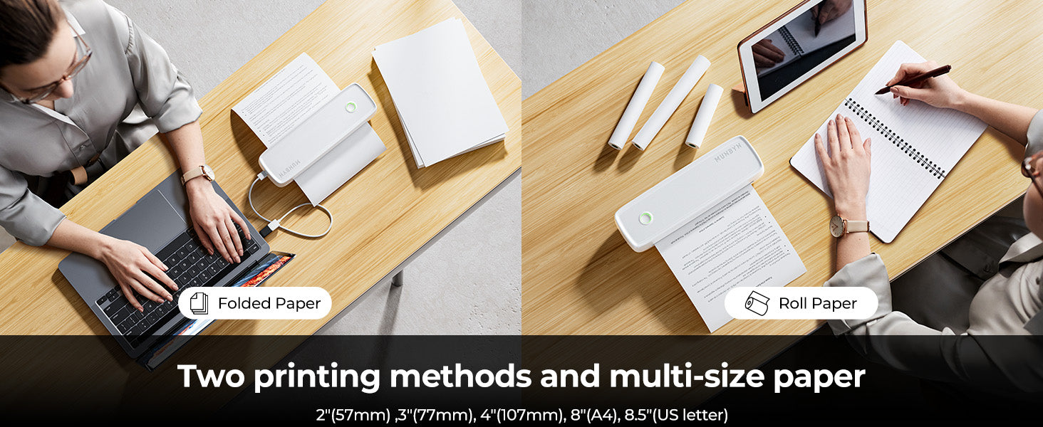 Inkless printer: No ink, toner or ribbon required. This printer can support A4/USLetter/Legal/4"/3"/2" roll thermal paper and A4/US Letter size folded thermal paper.