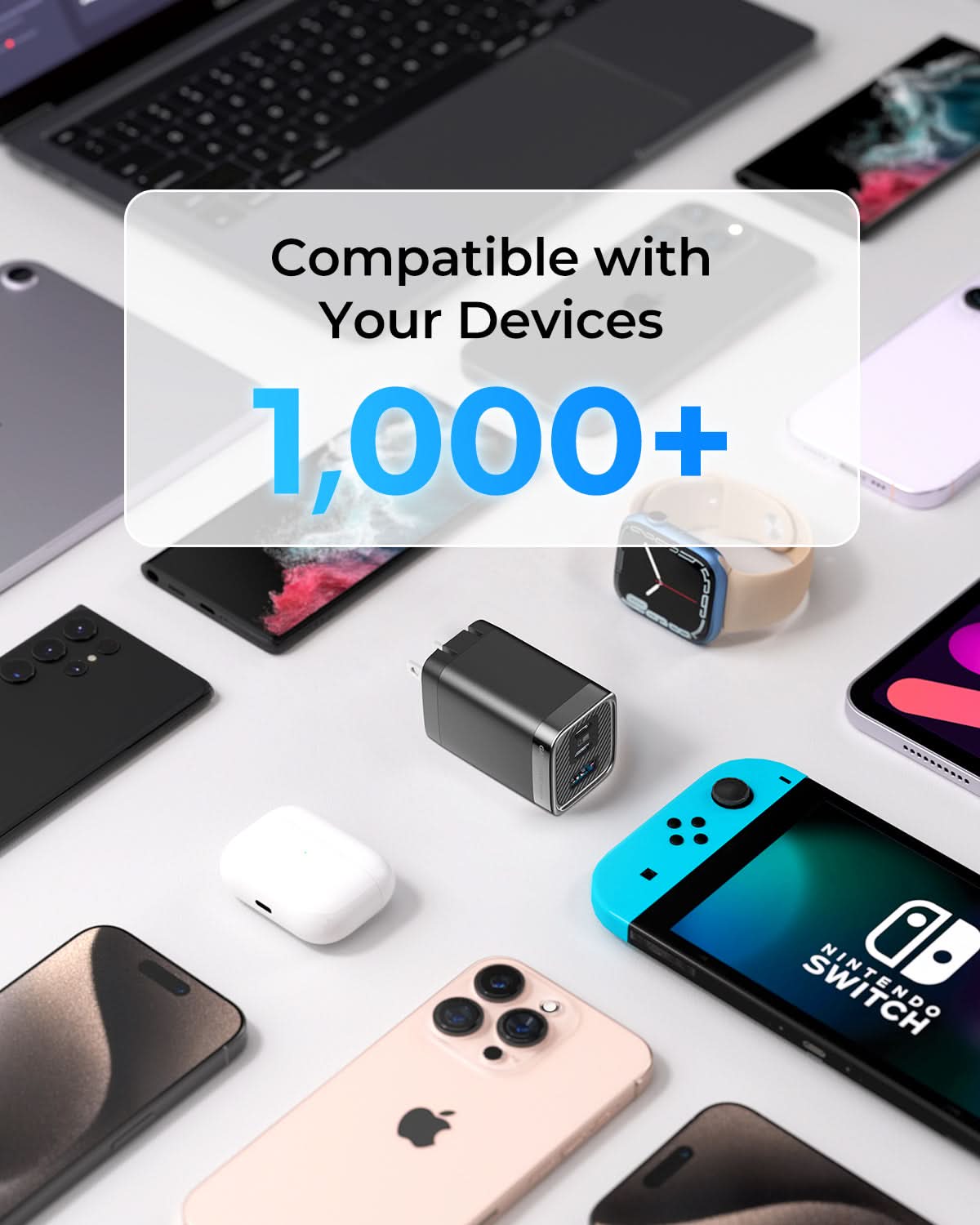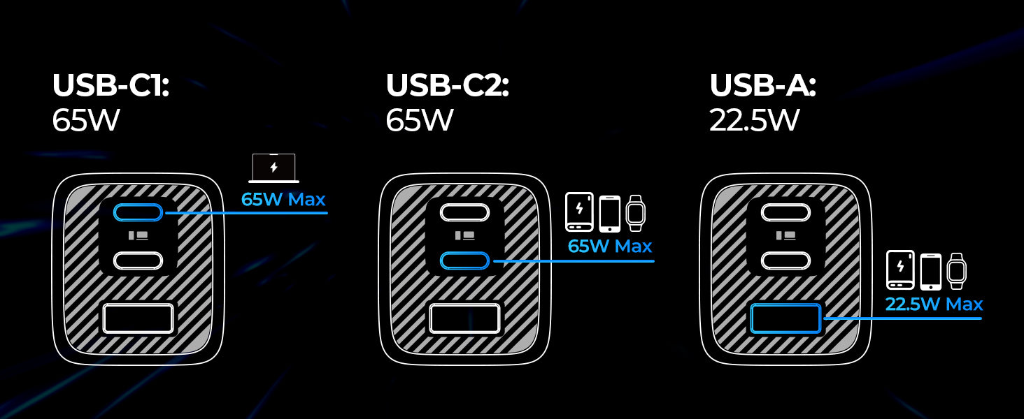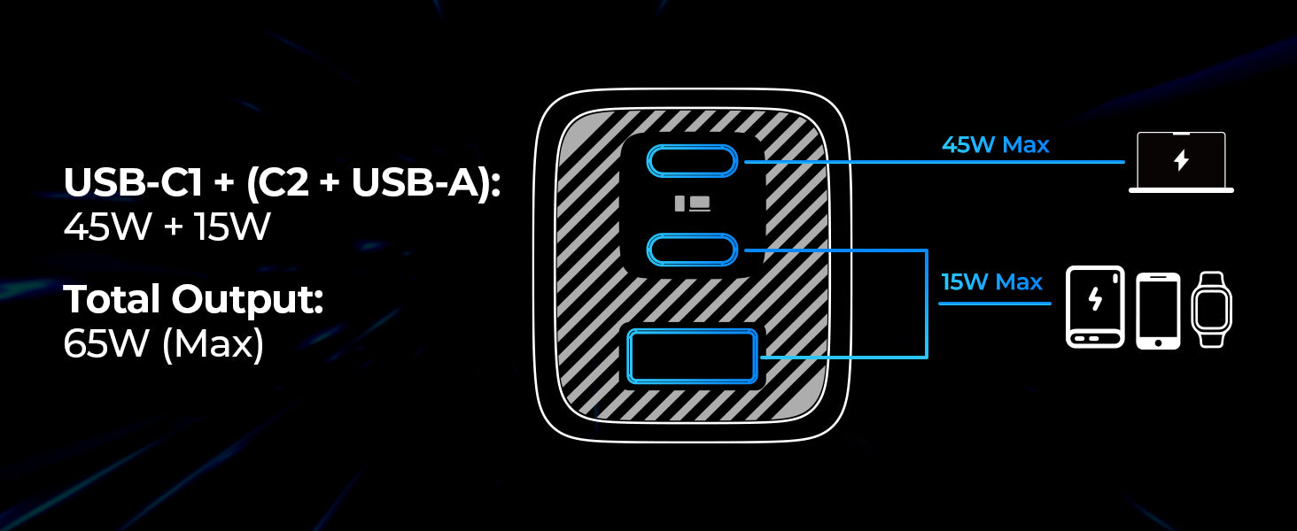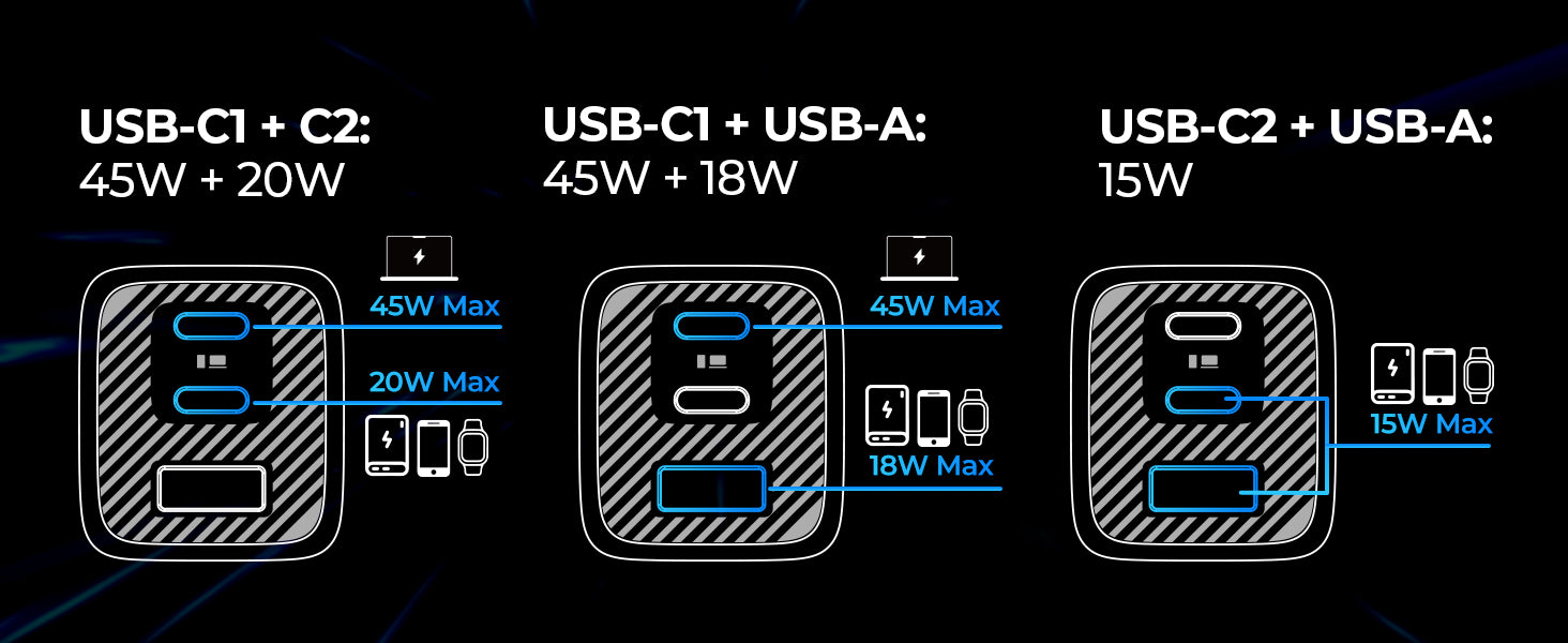 Using two ports simultaneously: C1 (45W) + C2 (18W) or C1 (45W) + USB-A (15W);