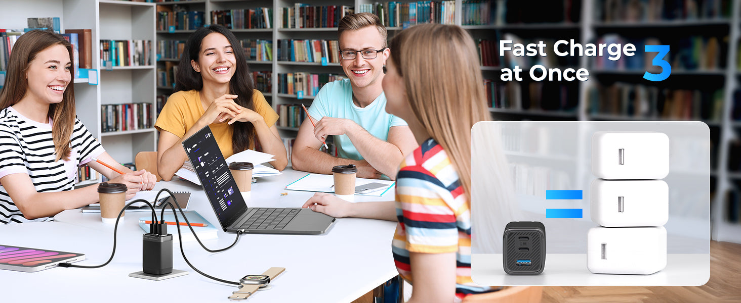 Using three ports simultaneously: C1 (45W) + C2 (15W) + USB-A (5W).