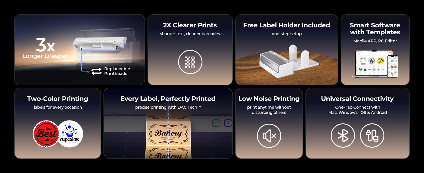 • Exclusive Dual-Color Label Power: Elevate your branding with MUNBYN Black/Red or Black/Blue dual-color labels (sold separately). Create striking two-tone designs effortlessly using our free apps – make your labels stand out!
