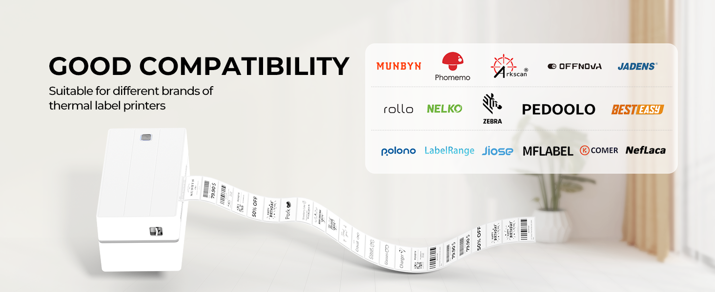 The thermal labels are compatible with MUNBYN, Jadens, Rollo, Phomemo, iDPRT, Zebra, OFFNOVA, CLABEL, Beeprt, ASprink, POLONO, LabelRange, Jiose, PRT, Itari, K Comer, Neflaca, Mflabel, Arkscan, Besteasy and other direct thermal printers. Not compatible with NIIMBOT, Dymo, Brother